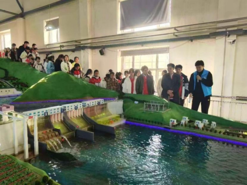 宣讲人引导同学们参观,对设施进行逐一详细的讲解,并对参与人员提出的疑问进行解释说明,同学们认真学习有关我国水利设施相关知识。